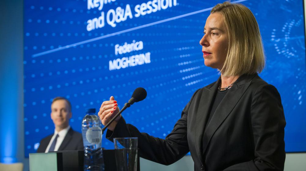 HR/VP delivering keynote speech at EUISS Annual Conference