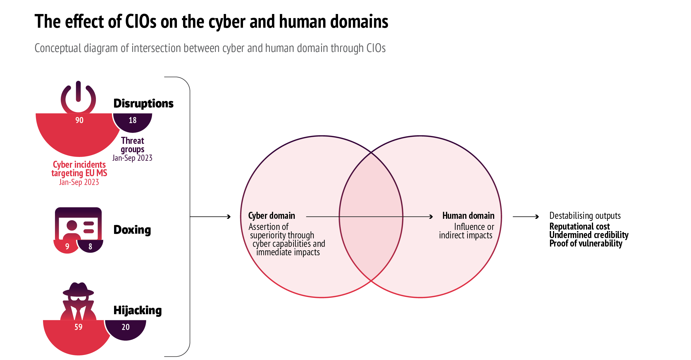 CIOs can thus be defined as operations with a cross-domain effect: by compromising a virtual infrastructure – courtesy of the cyber domain – they pave the way to achieving an impact in the broader human domain, where influence and perception are the main factors at play. There has been a proliferation of CIOs, leading to constant, high-volume, high-scale activities in cyberspace.