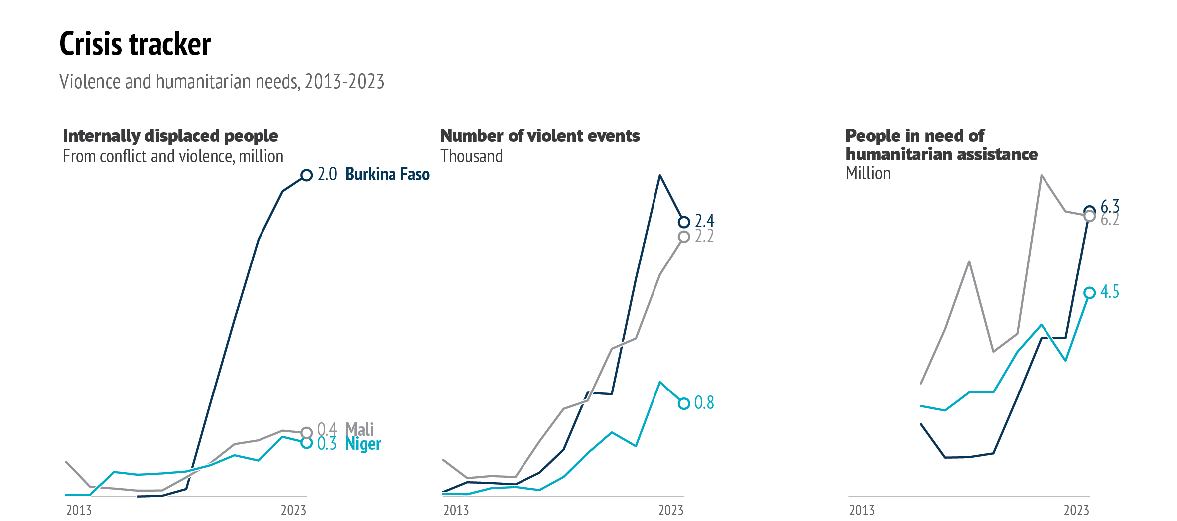Data: UN OCHA, 2024; ACLED, 2024; IOM, Migration Data Portal, 2024